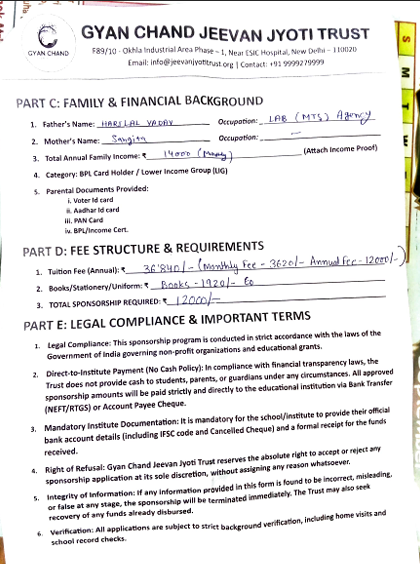 Gyan Chand Jeevan Jyoti Trust extended financial assistance to Sandhya Yadav, a Class VII student of Saraswati Bal Mandir, Lajpat Nagar, New Delhi.